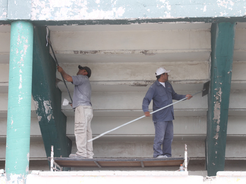 Empleados municipales resanan y rehabilitan las gradas y bardas del parque de beisbol Jaime Canales Lira