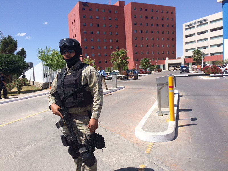 Decenas de militares, policías federales, estatales y municipales, además de agentes vestido de civil, resguardan el nosocomio donde más tarde será ofrecida una conferencia de prensa por el fiscal generla del estado