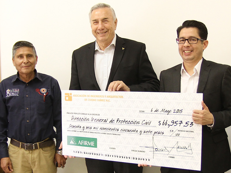 La Asociación de Ingenieros y Arquitectos de Ciudad Juárez AC entregó a la Dirección General de Protección Civil la cantidad de 66 mil 957 pesos, para la adquisición de nuevo equipo