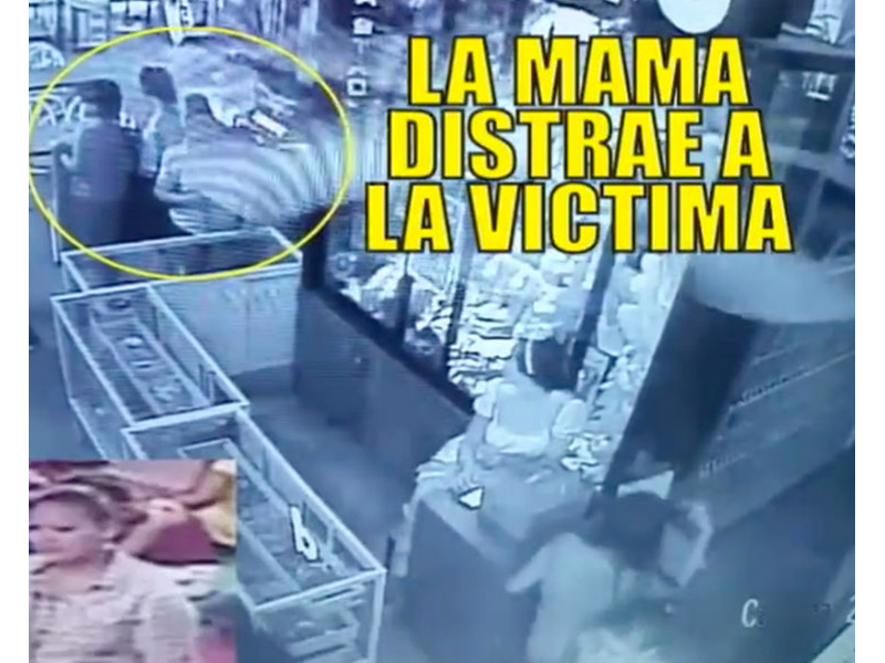 Foto de video donde la mamá del niño distrae a una de las empleadas del negocio quien tiene el celular cerca de la caja registradora
