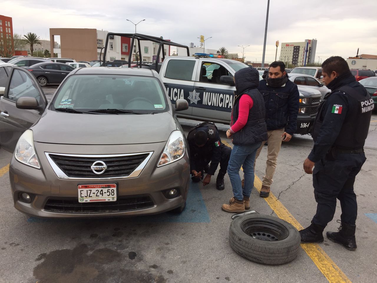 Agentes de la patrulla 546-V de la SSPM realizaban el recorrido cuando vieron a las personas batallando para sacar la llanta, por lo que los ayudaron