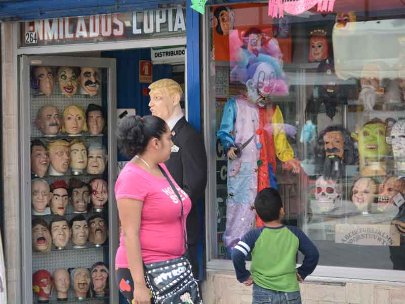 Sus máscaras de látex son ofrecidas a los fronterizos en el centro de la ciudad desde principios de octubre, junto con las de Hilary Clinton, Joaquín “El Chapo” Guzmán Loera, Enrique Peña Nieto, Angélica Rivera, Frida Kahlo, Cantinflas y Chucky, el muñeco terrorífico