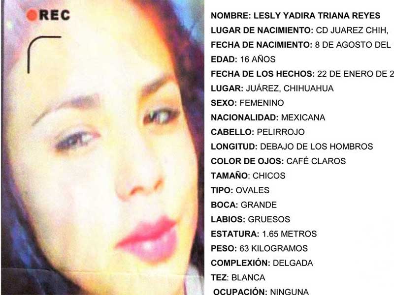 Lesly Yadira Triana Reyes, de 16 años de edad y reportada como ausente por sus familiares ante la Fiscalía. Se fue de su casa por problemas familiares.