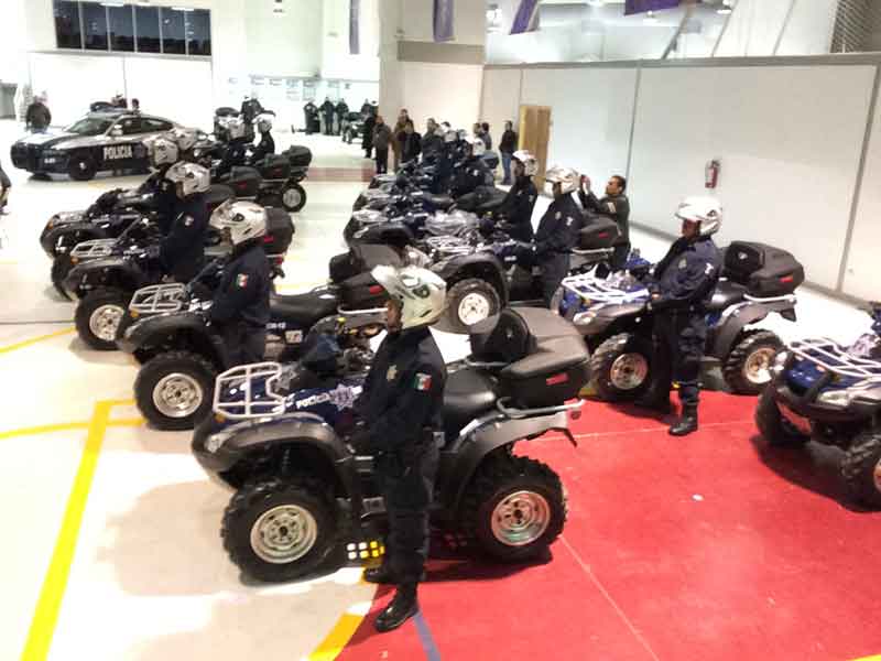 Junto a las 31 motocicletas, fueron entregados 9 autos-patrulla Charger último modelo completamente equipados y 2 mil 334 chamarras oficiales para cada agente de la corporación, así como cascos y guantes para el uso de las nuevas cuatrimotos