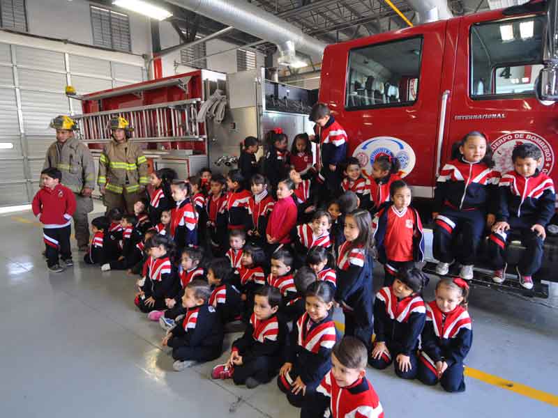 Más de 55 niños del Centro Educativo Gimnástico Regional recorren instalaciones del Cuerpo de Bomberos, donde les enseñan como actuar en caso de un incendio