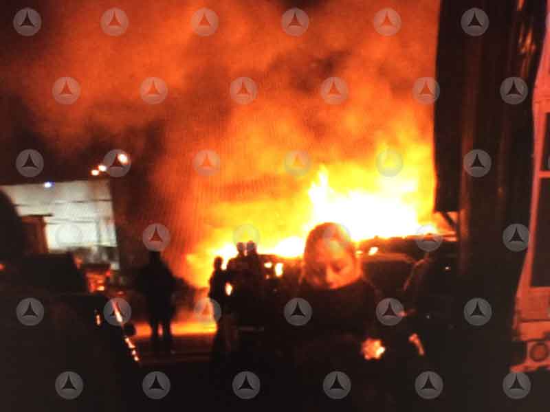 Incendio se registra en taller de agencia de autos y consume cinco vehículos, entre ellos una patrulla de Seguridad Pública