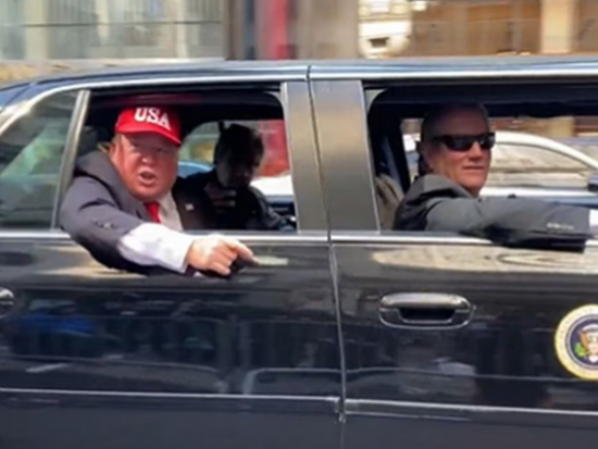 Un falso Trump en una limusina circulaba frente a la corte, gritando: “No es un juicio, es una persecución”