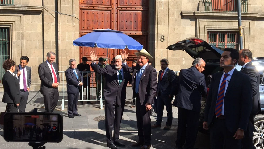 Arriba a la sede del Poder Ejecutivo acompañado por el embajador de Estados Unidos en México, Ken Salazar