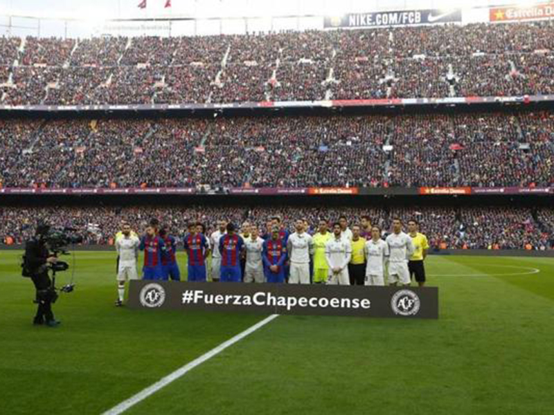 Jugadores del Barcelona y Real Madrid se juntaron para la foto oficial, donde lucieron una manta con la leyenda "#FuerzaChapecoense"
