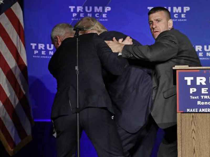 El empresario neoyorquino interrumpió su discurso por algo que sucedía entre el público cuando dos agentes del Servicio Secreto subieron al escenario y lo sacaron corriendo hacia la parte trasera