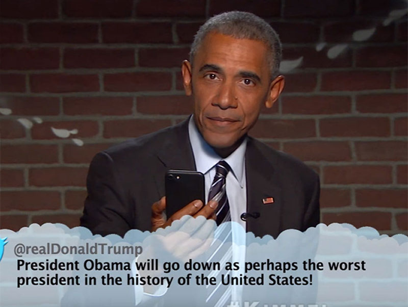 El aún presidente de los Estados Unidos se presentó en Jimmy Kimmel Live, donde respondió algunos mensajes de odio contra él, incluyendo uno de Donald Trump