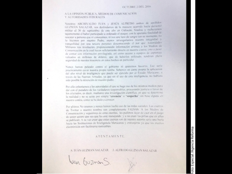 En una carta firmada por los hijos del narcotraficante Joaquín "El Chapo" Guzmán Loera, difundida por su defensa, se pide a autoridades ubicar a los responsables del ataque a militares en Culiacán, Sinaloa