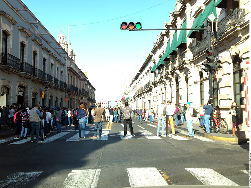 Normalistas encabezan este viernes una protesta en el centro de Morelia en contra de la iniciativa para promulgar en Michoacán una ley que regule las manifestaciones públicas en la entidad