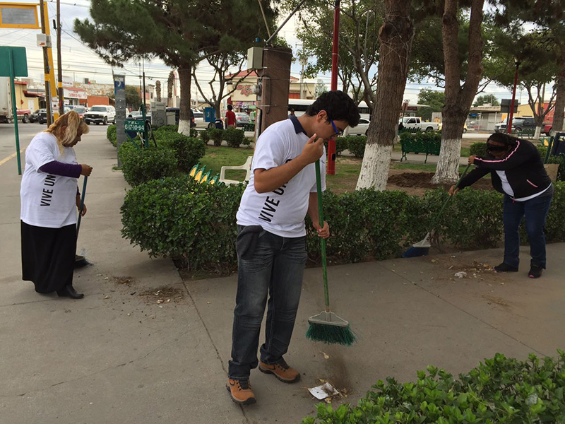Decenas de trabajadores de la empresa Lear acompañados de sus hijos realizaron por segunda ocasión la limpia del parque de la plaza de San Lorenzo