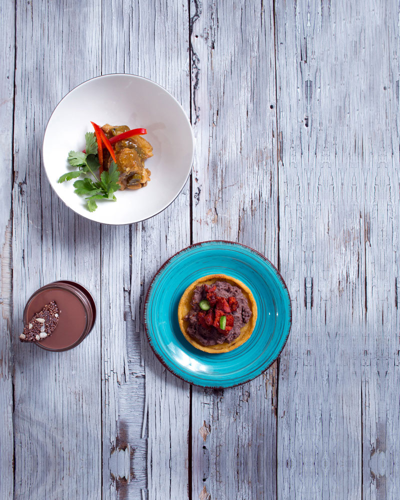 Sope con frijoles y longaniza, Chicharrón en verde y Natilla de chocolate sin huevo