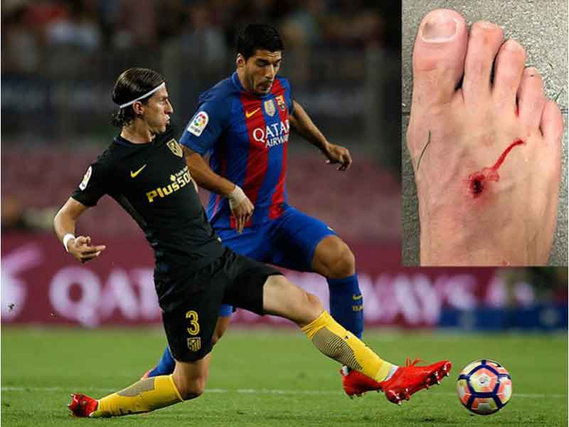 El zaguero brasileño del Atlético de Madrid publicó en Instagram una imagen de su empeine herido tras una entrada del delantero charrúa