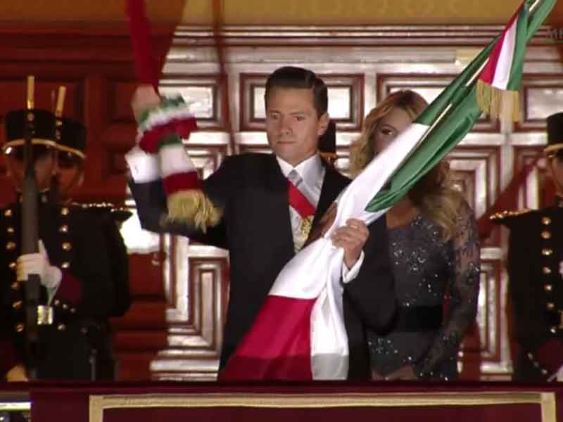 En punto de las 23:00 horas, el mandatario junto con su esposa, Angélica Rivera de Peña, salió al Balcón Central de Palacio Nacional para reproducir la tradicional arenga a los mexicanos