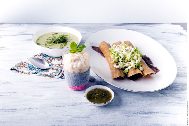 Receta de Crema de chile poblano y queso, Flautas de carne adobada y Tapioca con leche y amaranto
