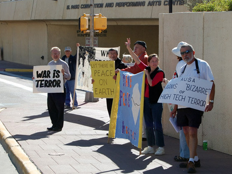 Miembros de la organización Presencia por la Paz en El Paso se manifestaron ayer en contra de la militarización de la frontera con México y el mundo, y que deja como resultado la enemistad del mundo con Estados Unidos
