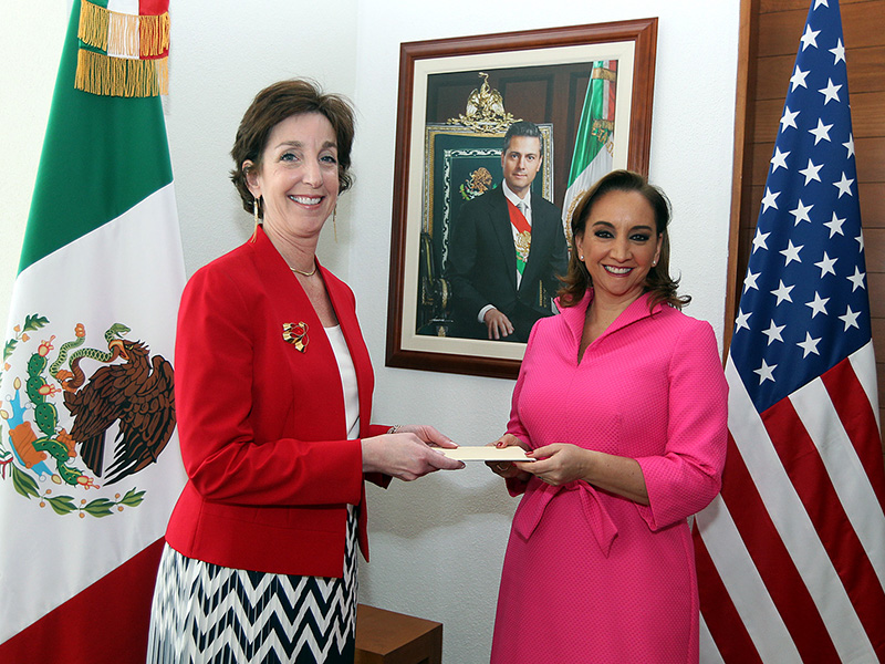 La diplomática arribó a las instalaciones de la Cancillería a las 10:23 horas y se reunió con la Canciller Claudia Ruiz Massieu por menos de una hora.