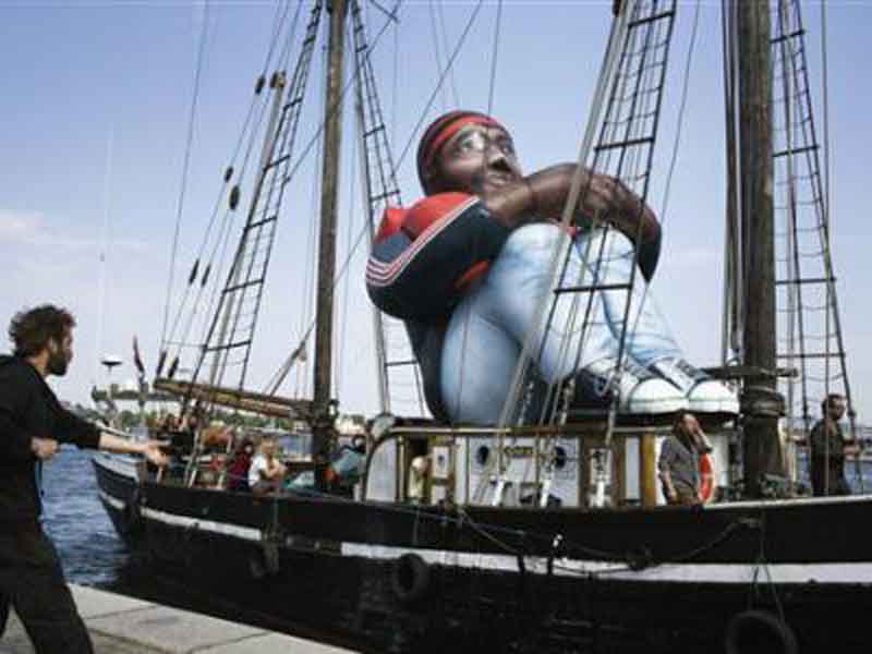 Es una obra del colectivo artístico belga Shellekens y Peleman, describe un refugiado con chaleco salvavidas que se sostiene las rodillas arriba de la embarcación de madera