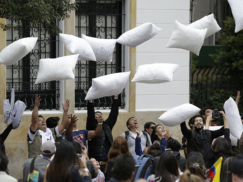 Cientos de jóvenes colombianos realizaron el jueves en el centro de la ciudad un acto simbólico llamado "guerra de almohadas" a fin de dar un mensaje de paz y armonía.