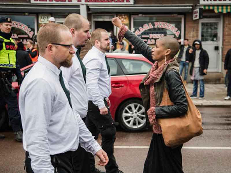 La activista sueca de 42 años Tess Asplund va camino de convertirse en una heroína nacional después de ser fotografiada desafiando a 300 neonazis
