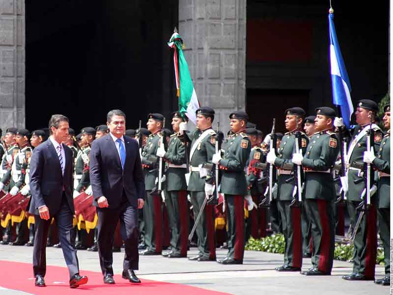 Una hora después de lo programado, el Presidente Enrique Peña Nieto recibió en Palacio Nacional a su homólogo de Honduras, Juan Orlando Hernández.