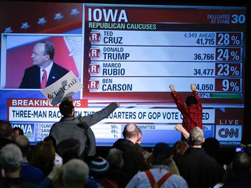 El senador republicano Ted Cruz y la precandidata demócrta Hillary Clinton encabezan los votos en las asambleas electorales de Iowa, marcadas por niveles sin precedentes de participación popular