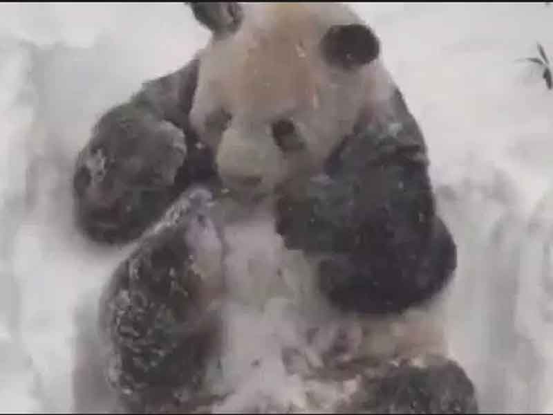Uno de los pandas del Parque Nacional Smithsonian no pudo contener su emoción y se puso a jugar en la nieve durante la mañana de este sábado