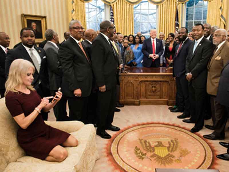 La mujer se sienta con sus pies, ligeramente abiertos, sobre un sofá en medio de una reunión con el presidente de EU y otros personajes