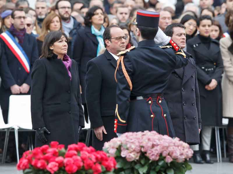 El presidente François Hollande y la alcaldesa de París, Anne Hidalgo, depositaron una corona de flores en la estatua de Marianne, símbolo de la república francesa, en el centro de París