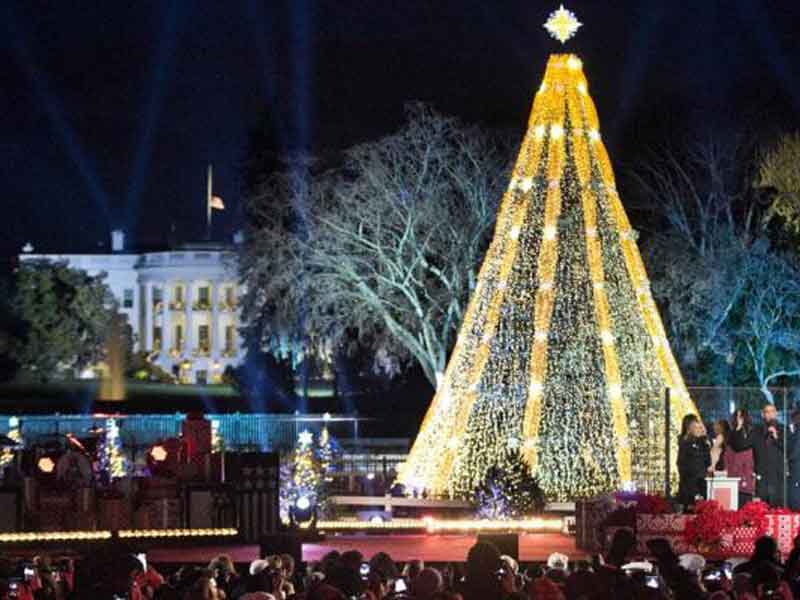 Obama, su esposa, Michelle, sus hijas Malia y Sasha, y su suegra Marian Robinson accionaron juntos el interruptor que encendió el árbol