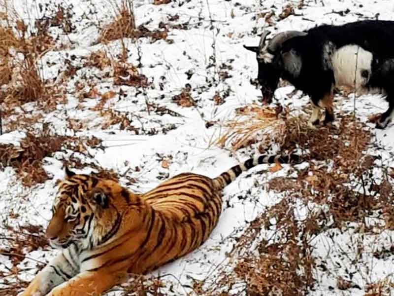 Un ejemplo de convivencia ocurrió en zoológico de Rusia donde una cabra que estaba destinada a morir, no mostró ningún indicio de miedo y ahora vive con el felino