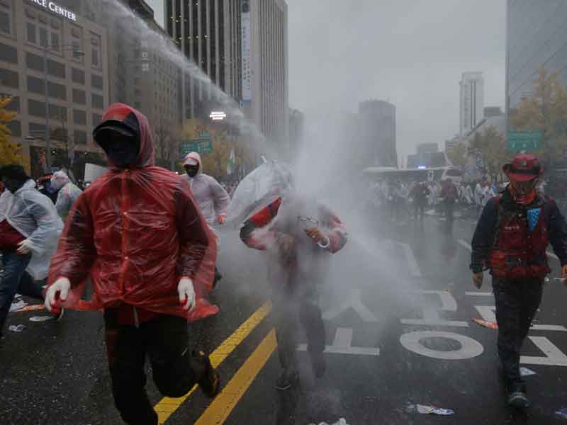 La policía utilizó gases lacrimógenos y cañones de agua ayer en choques con manifestantes contrarios al gobierno que marcharon por Seúl