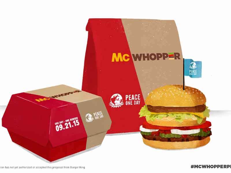 Propuso a su rival McDonald's sumar fuerzas para crear el "McWhopper" en ocasión del Día Internacional de la Paz.