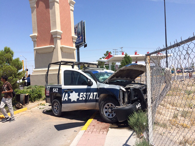 Una unidad de la Policía Estatal identificada con el número 642 atendía una emergencia y al llegar al cruce de bulevar Zaragoza y Parral intentó esquivar un vehículo pero se subió a una jardinera y terminó impactándose con el vehículo