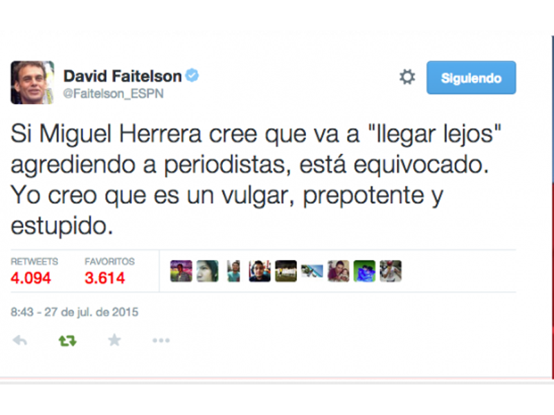 La afición y periodistas como León Krauze y David Faitelson exigen a la Federación Mexicana de Futbol la renuncia de Miguel Herrera, luego de la agresión en contra del periodista Christian Martinoli