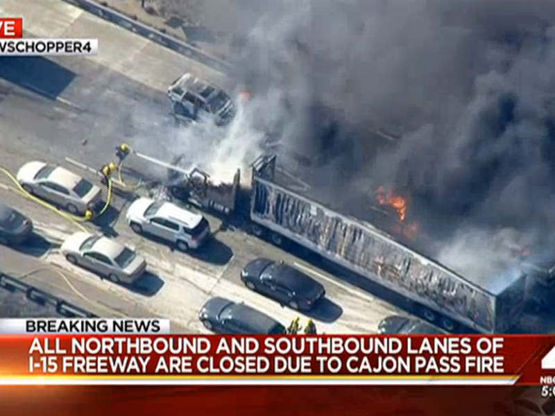El fuego, atizado por los vientos provenientes del desierto, ardía en ambos lados de la Interestatal 15, la principal vía de intenso tránsito que conecta el sur de California y Las Vegas.