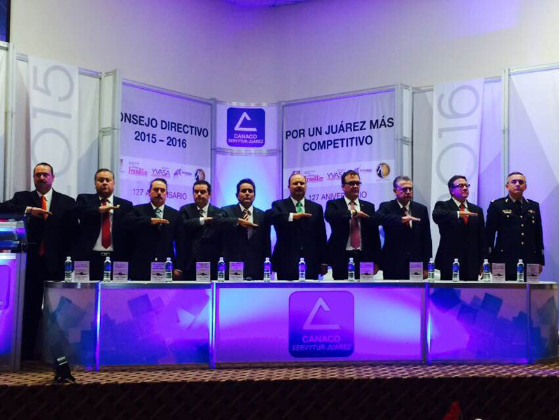 El gobernador Cesar Duarte Jáquez tomó protesta al nuevo consejo directivo de la Cámara Nacional de Comercio Servicios y Turismo de Ciudad Juárez (Canaco) para el periodo 2015-2016 que preside el empresario Alejandro Ramirez Ruiz.