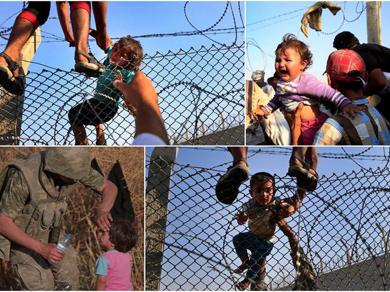 Miembros de las fuerzas del orden turcas dan de beber agua a los menores y los ayudan a cruzar entre las rejas con púas