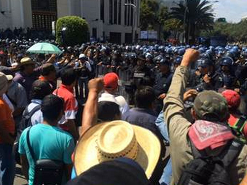 Elementos de la Policía Federal se movilizan en grupo, a la altura de Paseo de la Reforma y Bucareli, y observan la llegada de maestros al campamento que tienen en el Monumento a la Revolución.
