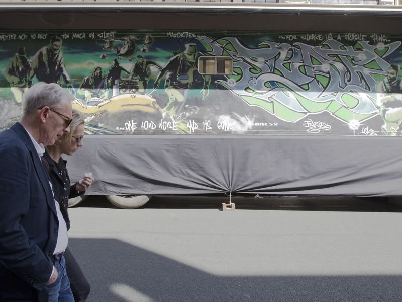 Pintada sin esténciles para el festival de Glastonbury durante los primeros años como artista del anónimo británico, la obra "Silent Majority" será sometida hoy a subasta