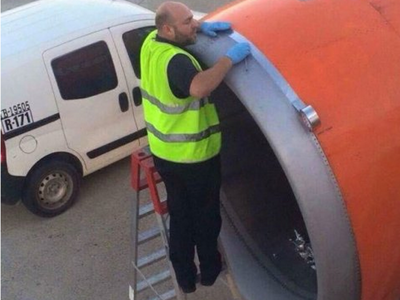 Un mecánico del aeropuerto estaba pegando una turbina con una cinta adhesiva que, en apariencia, era de uso doméstico.