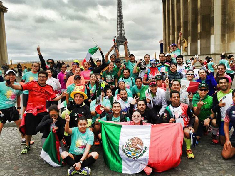 El grupo de 150 personas, participación mexicana récord en la carrera de la capital francesa, participó hoy con playeras con los colores de la bandera tricolor en una de las más importantes carreras en Europa