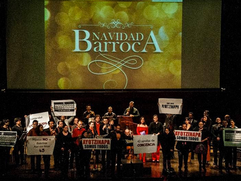 Los integrantes de la Orquesta Barroca de México levantaron pancartas con leyendas en favor de los normalistas desaparecidos