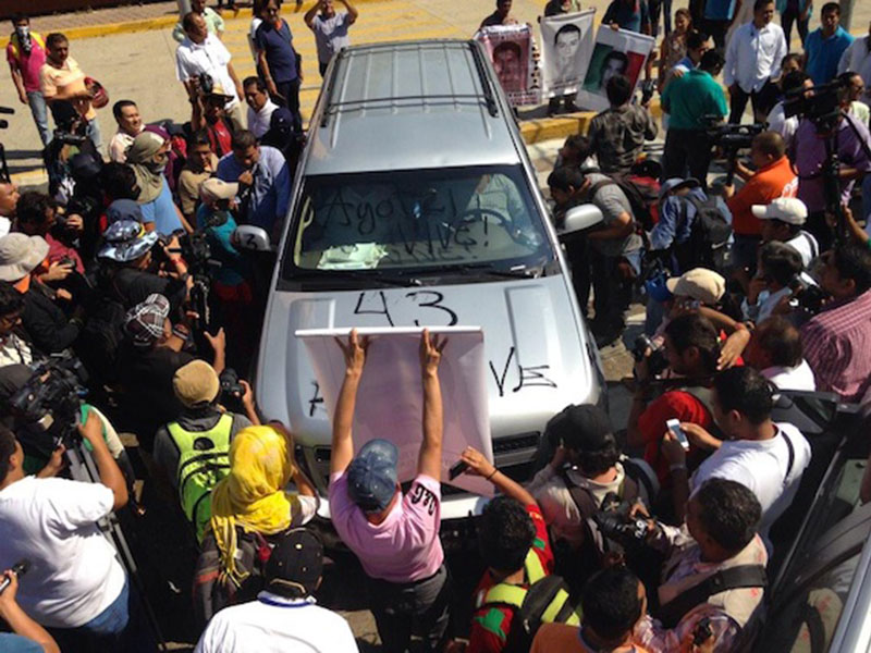 Lo rodean, lo grafitean y después le poncharon las llantas; anuncian más manifestaciones en Guerrero por desaparecidos de Ayotzinapa