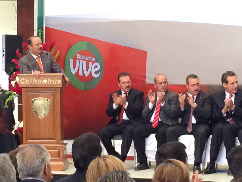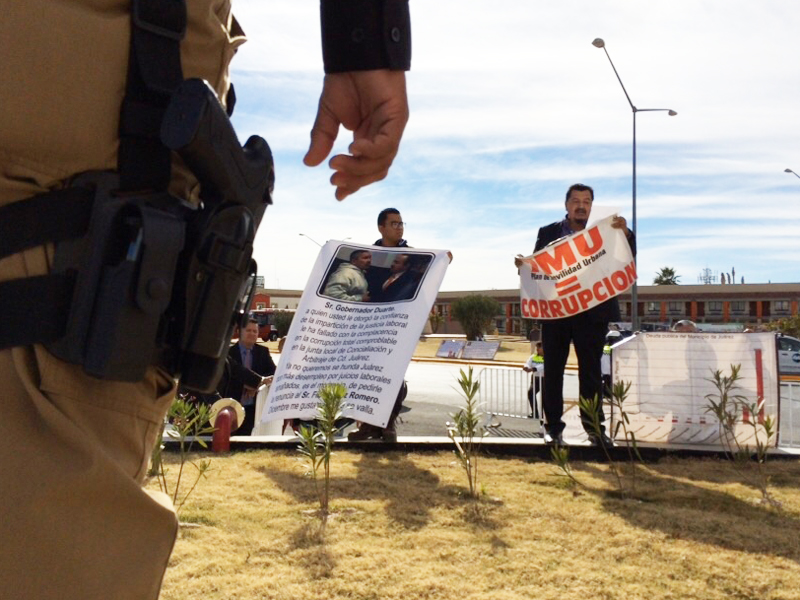 Un grupo de activistas protesta en el exterior de las nuevas oficinas de Gobierno del Estado, las cuales serán inauguradas este día por el gobernador del estado, César Duarte.