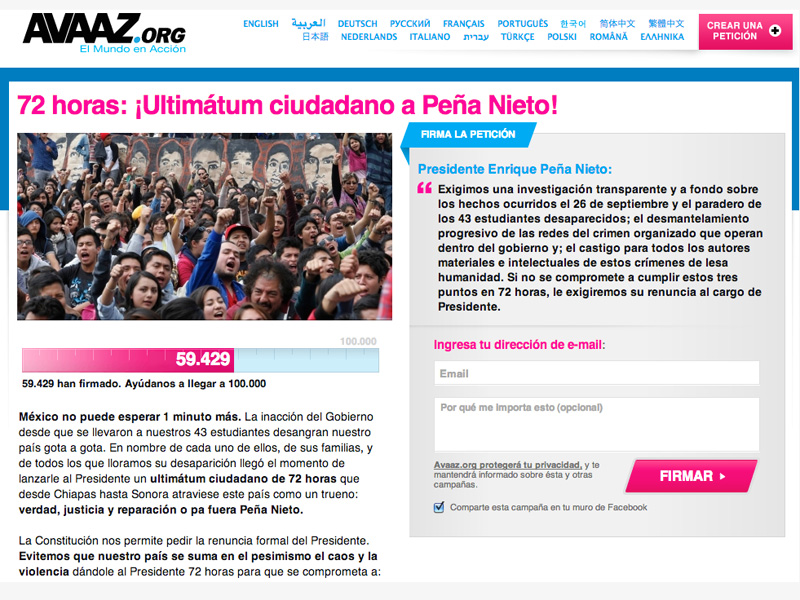 El proyecto ciudadano publicado en el portal http://www.avaaz.org/ ha logrado recaudar más de 59 mil firmas este 21 de noviembre a las 6 de la tarde.