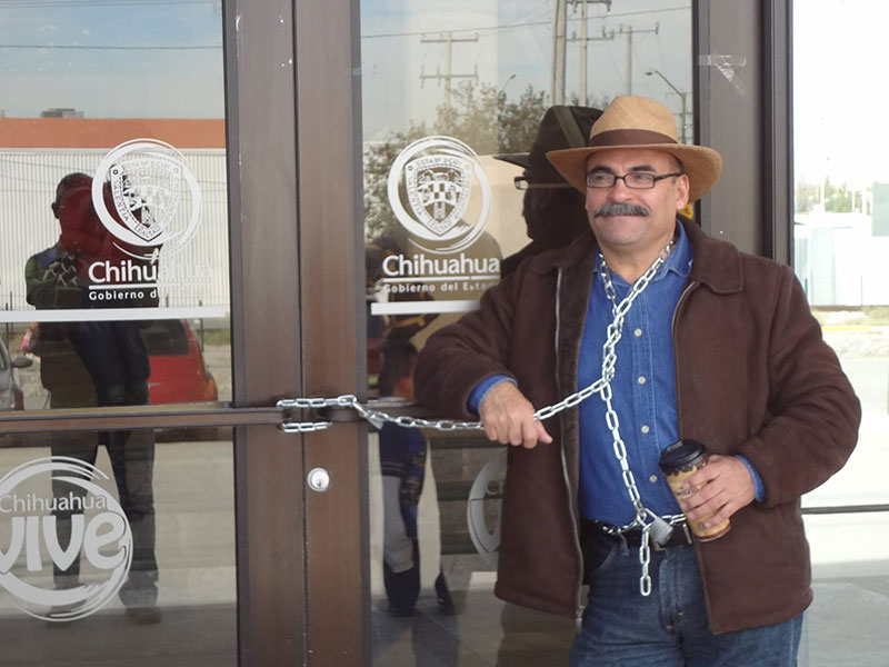 Un profesor de secundaria que exige su instalación al cargo de director en la Escuela Estatal 8368 en Infonavit Juárez Nuevo, se amarró ayer a las puertas de acceso de las oficinas de Gobierno del Estado del Eje Vial Juan Gabriel y Aserraderos.